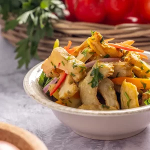 רצועות עוף עסיסיות מוקפצות עם מגוון ירקות טריים ...