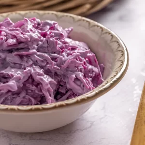 כרוב אדום פריך במיונז עשיר, מתובל בעדינות, יוצר ...