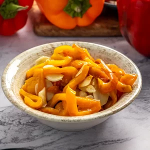 לקט פלפלים צבעוניים, פרוסים דק ומתובלים בעדינות, עם ...