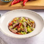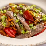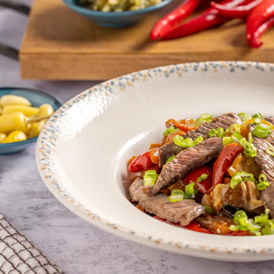 רצועות בשר בקר מוקפצות עם ירקות טריים ברוטב סויה וסילאן, בתיבול עדין. מנה קלה וטעימה.