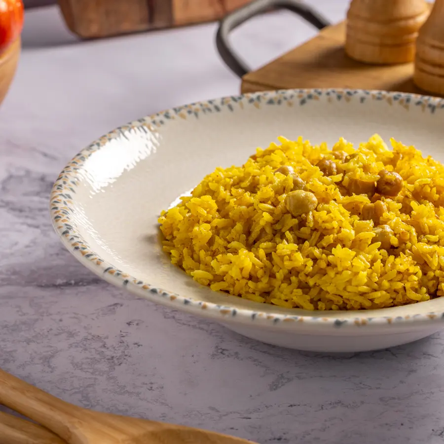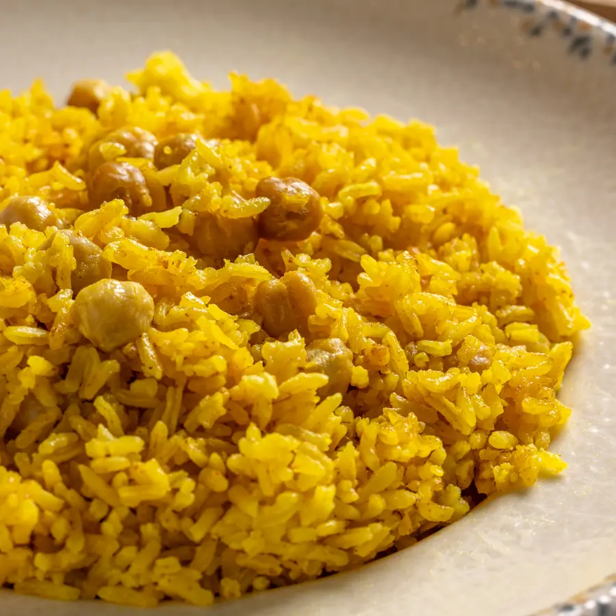אורז מתובל בכורכום ותבלינים, מבושל יחד עם גרגירי חומוס רכים לקבלת מנה צבעונית ומזינה.