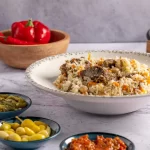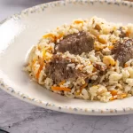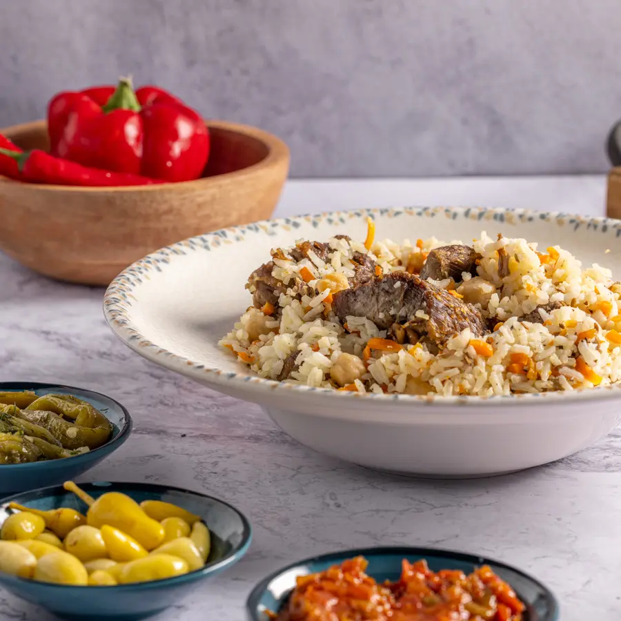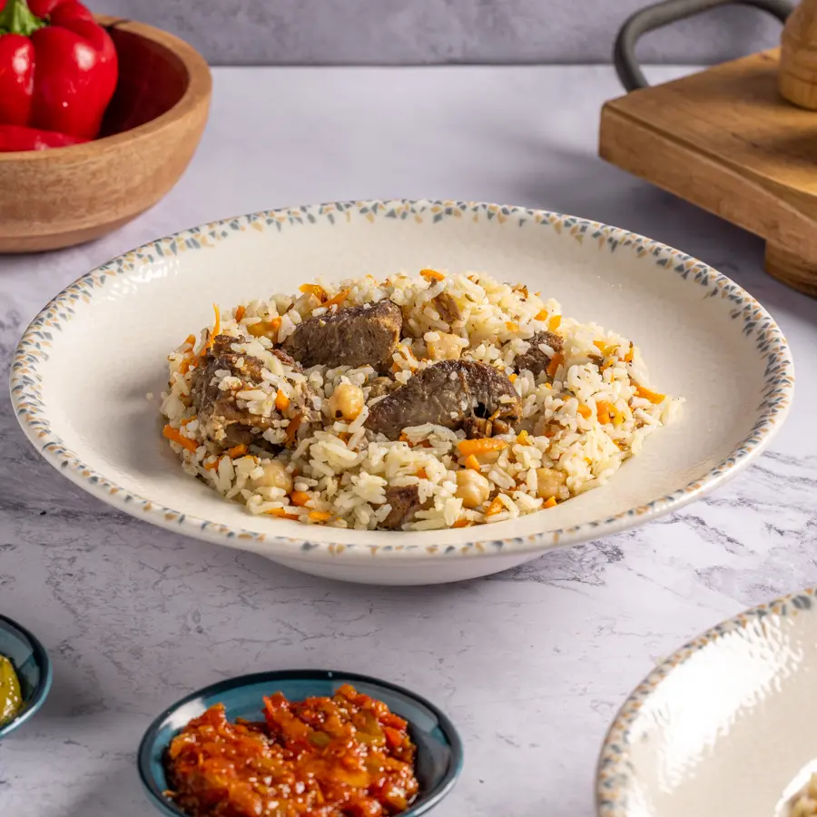 תבשיל אורז עשיר עם נתחי בשר בקר עסיסיים, גזר, ותבלינים ארומטיים, מבושל בסגנון מסורתי לקבלת טעמים עמוקים ומנחמים.