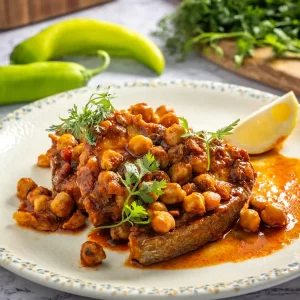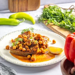 נתחי טונה עסיסיים מבושלים ברוטב עגבניות מזרחי פיקנטי, ...