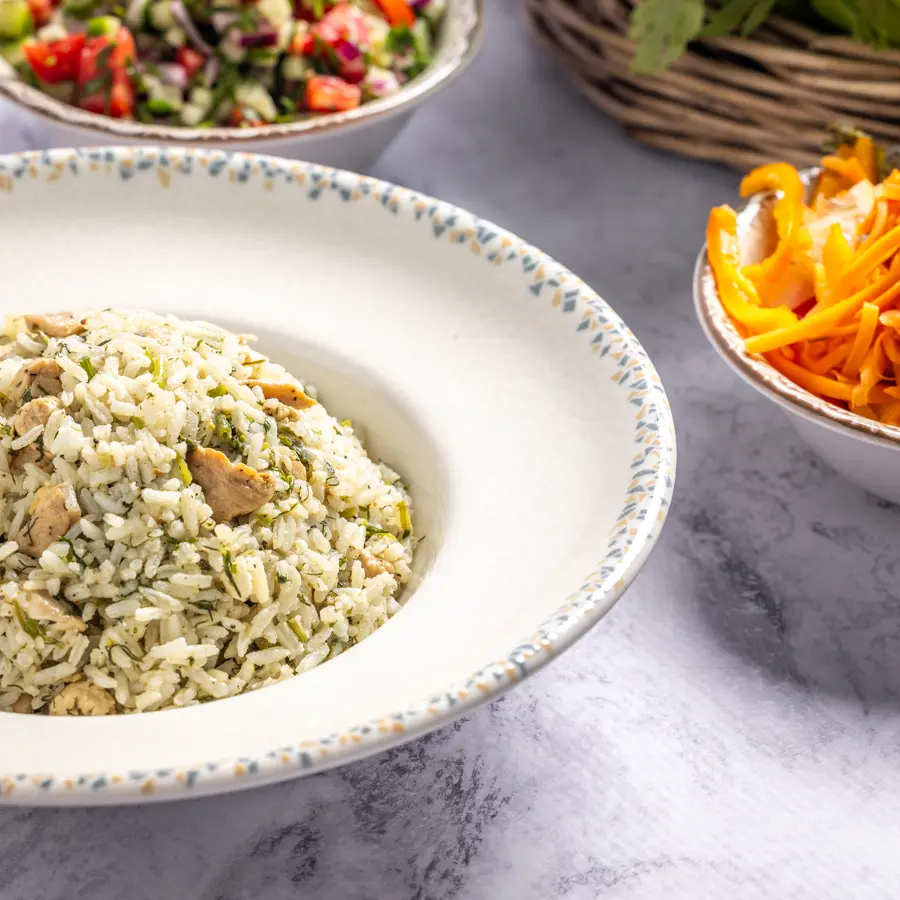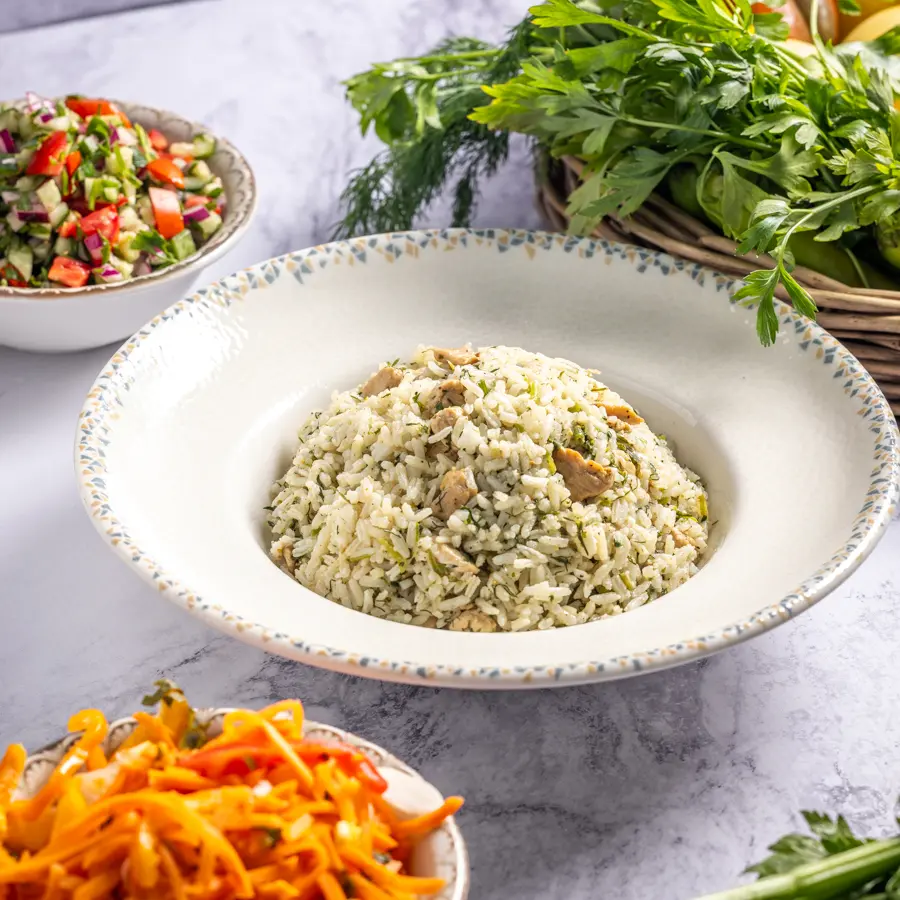תבשיל אורז מסורתי מהמטבח הבוכרי, מבושל עם עשבי תיבול ירוקים, בשר בקר טחון ותבלינים ייחודיים. מנה עשירה בטעמים אותנטיים.