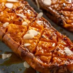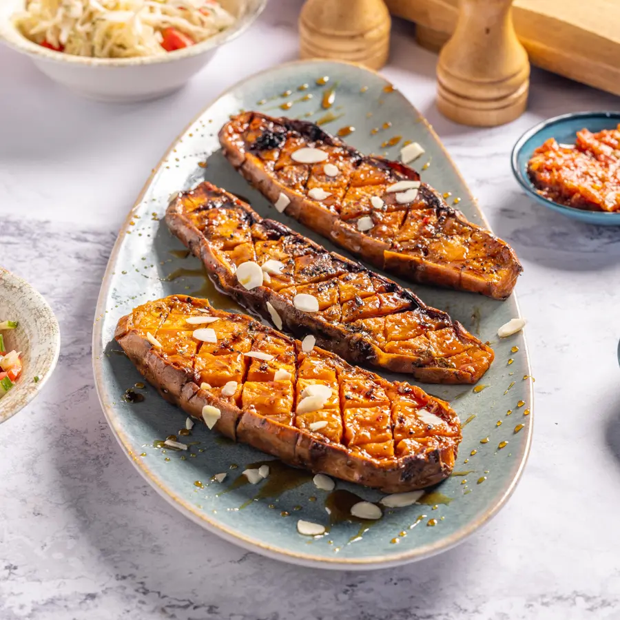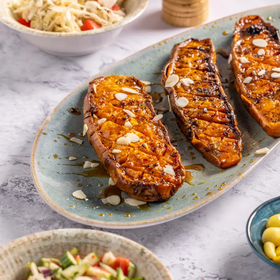 חצאי בטטה, מתובלות קלות ואפויות בתנור עד לרכות ולהזהבה.