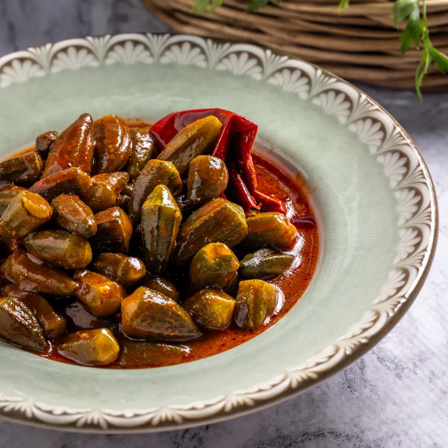 במיה טרייה מבושלת ברוטב עגבניות עשיר, מתובלת בעדינות עד לרכות מושלמת.
