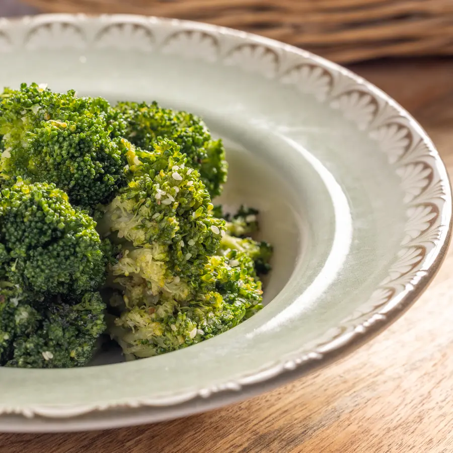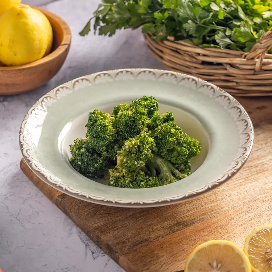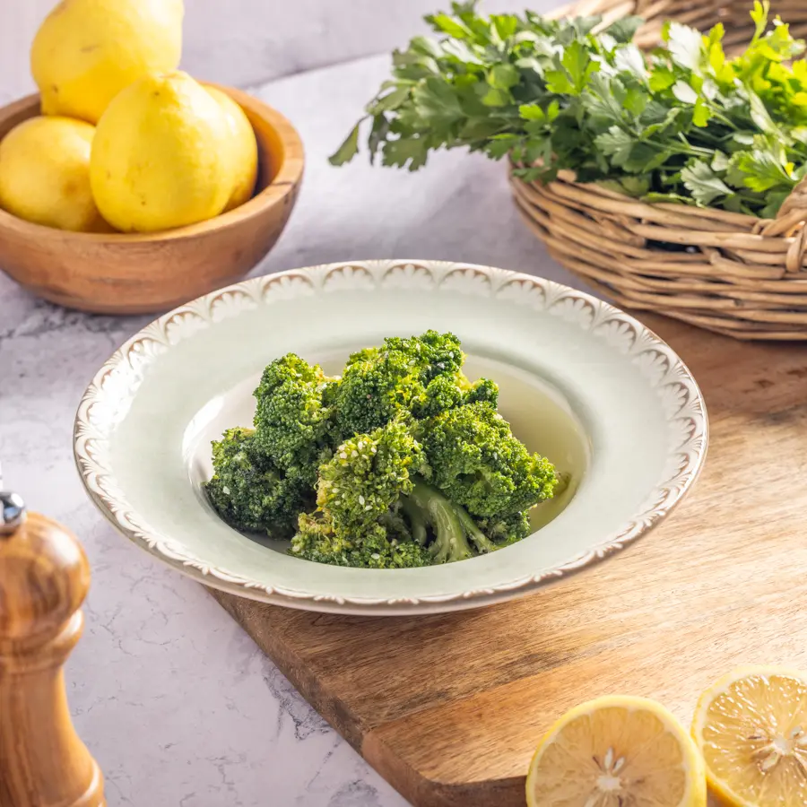 פרחי ברוקולי טריים מתובלים בשמן זית ותבלינים, נאפים בתנור עד להזהבה וקבלת מרקם פריך.