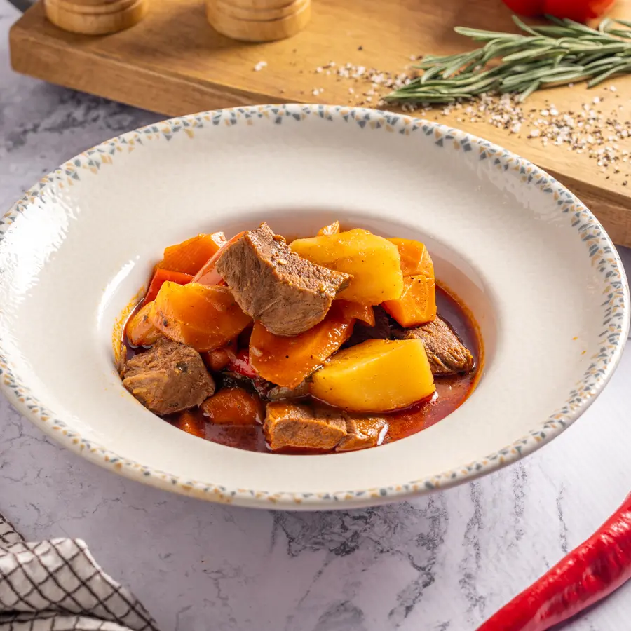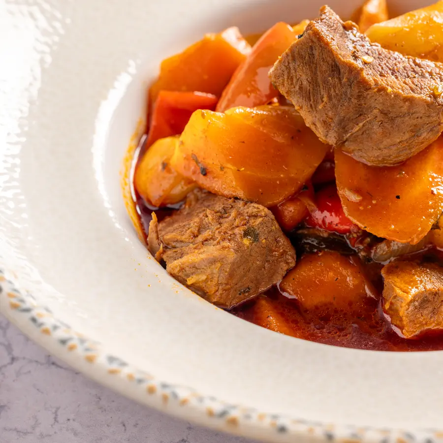 תבשיל קלאסי מבשר בקר חתוך לקוביות, מבושל באיטיות עם ירקות שורש ברוטב עשיר.
