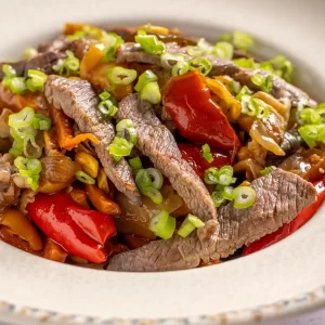 רצועות בשר בקר מוקפצות עם ירקות טריים ברוטב ...