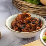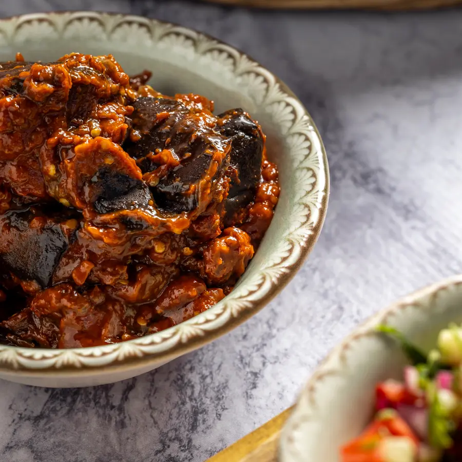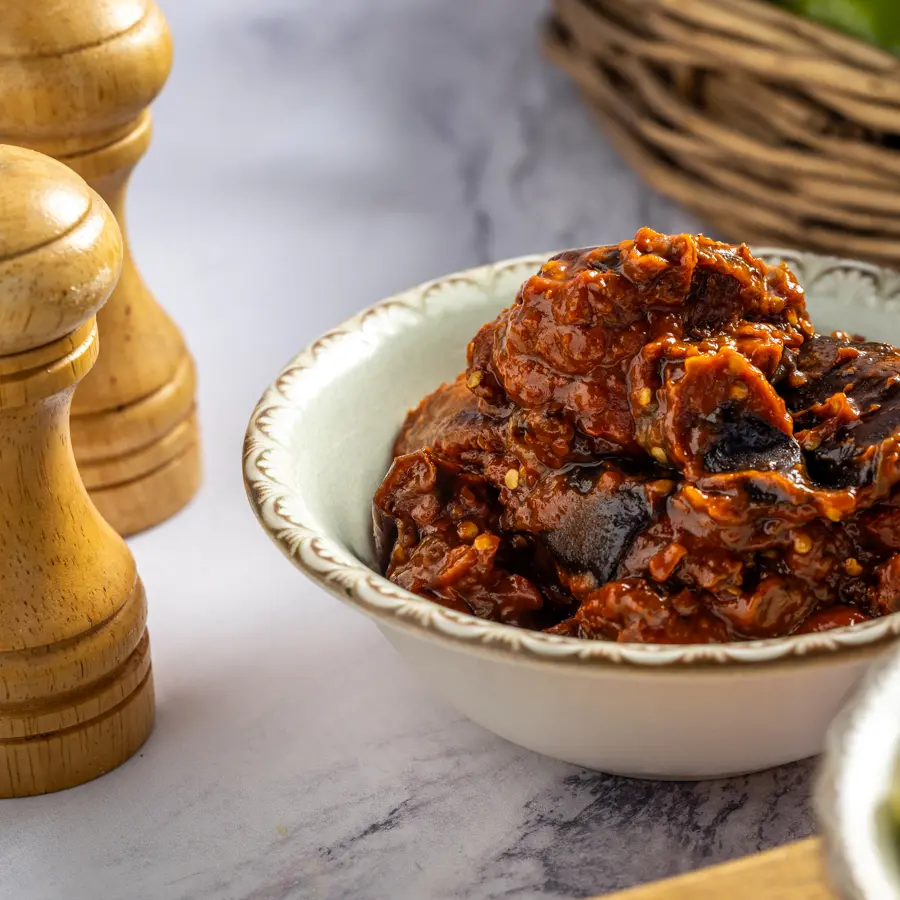 חציל קלוי ומעוך עם תערובת של פלפלים חריפים, ...