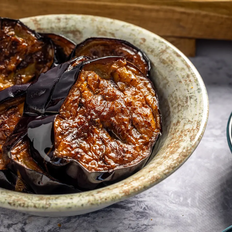 פרוסות חציל דקות, מצופות קלות ומטוגנות עד להזהבה ופריכות.