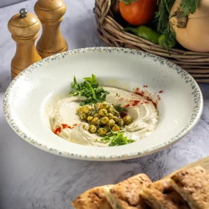 ממרח חומוס חלק וקרמי, עשוי מגרגירי חומוס מבושלים, ...