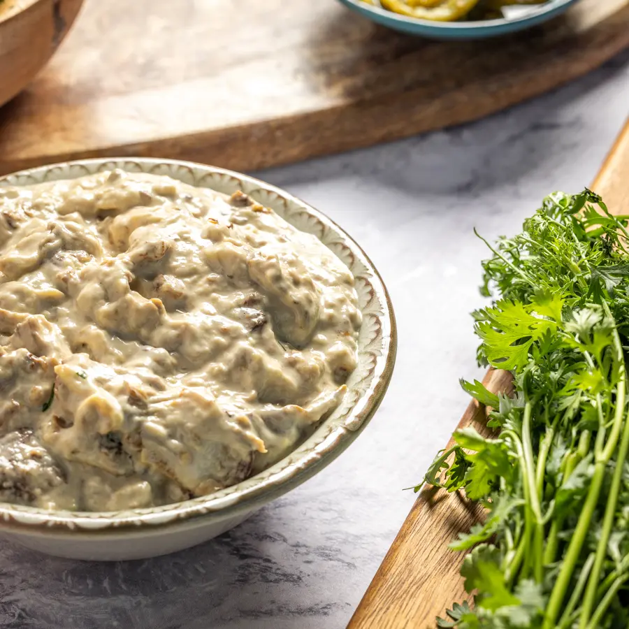 חציל קלוי בטחינה עשירה וקרמית, עם נגיעות לימון ושום, שמשלבות טעמים מעושנים ורעננים בכל ביס.