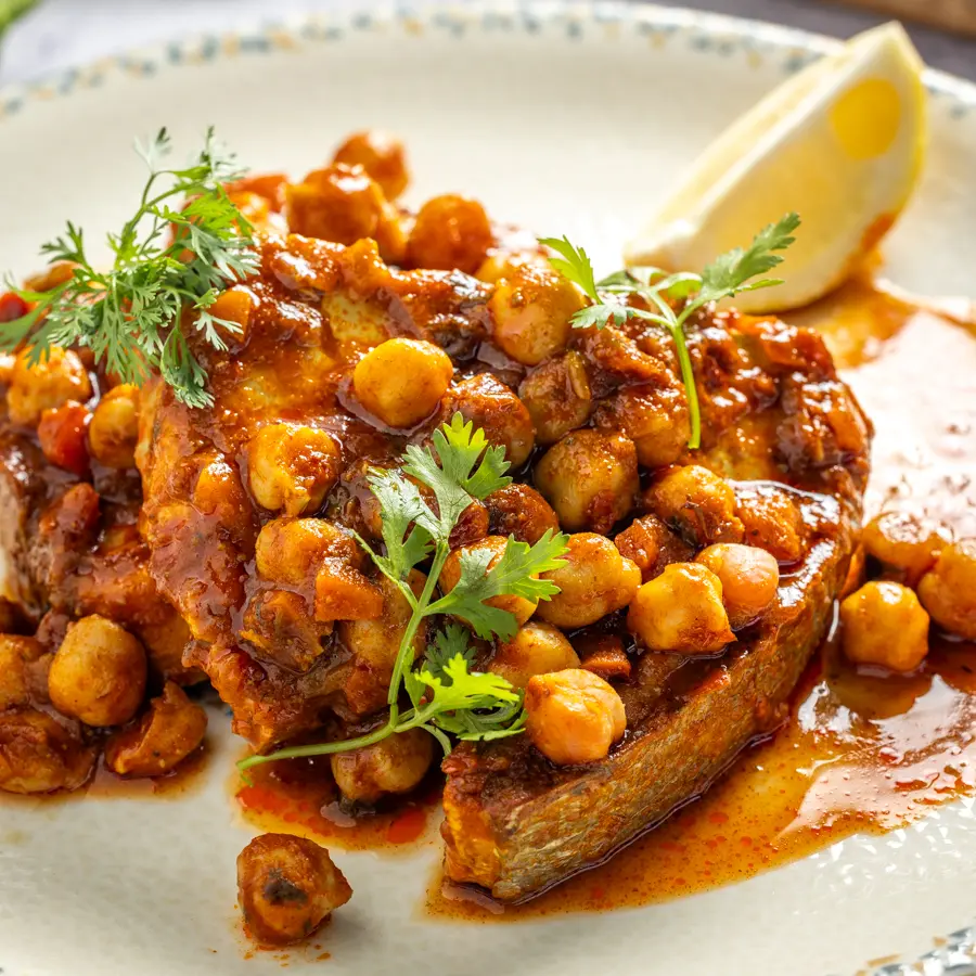 נתחי טונה עסיסיים מבושלים ברוטב עגבניות מזרחי פיקנטי, מתובל בעדינות עם תערובת תבלינים ארומטיים. מנה עשירה בטעמים.