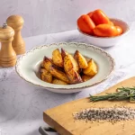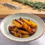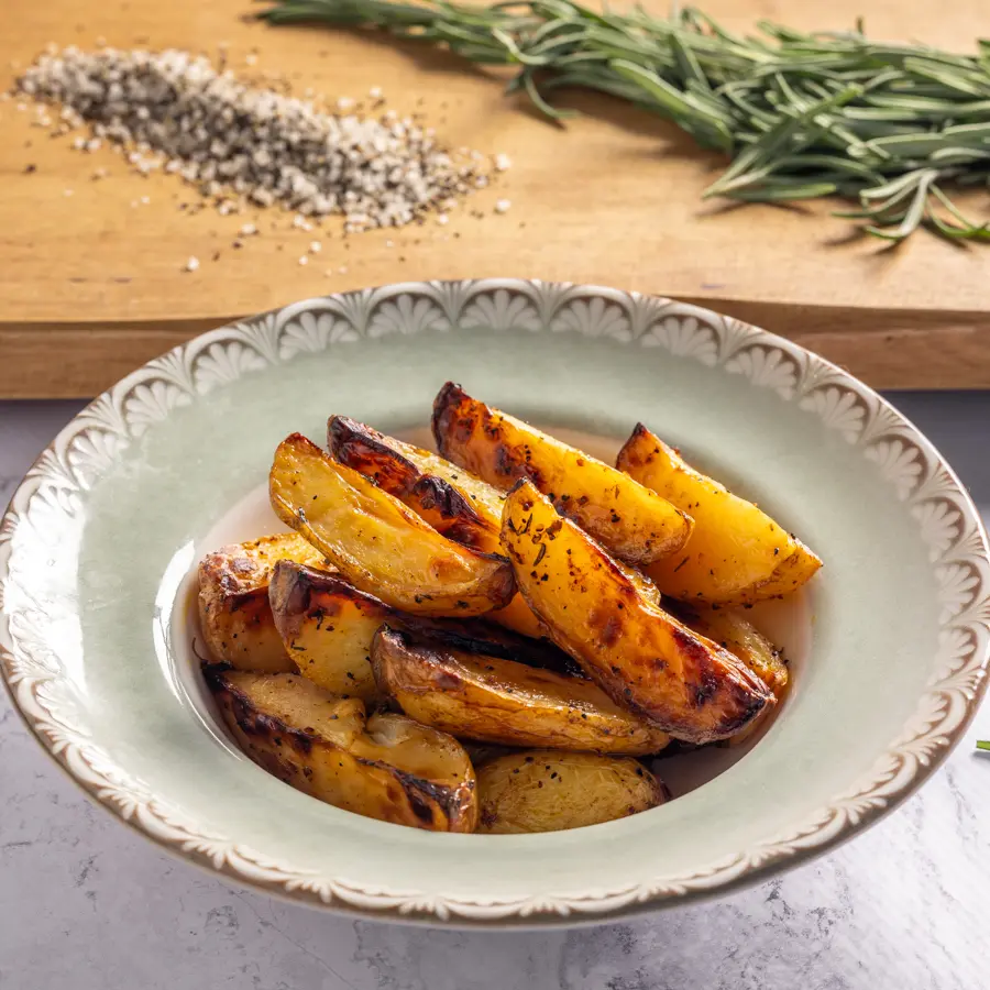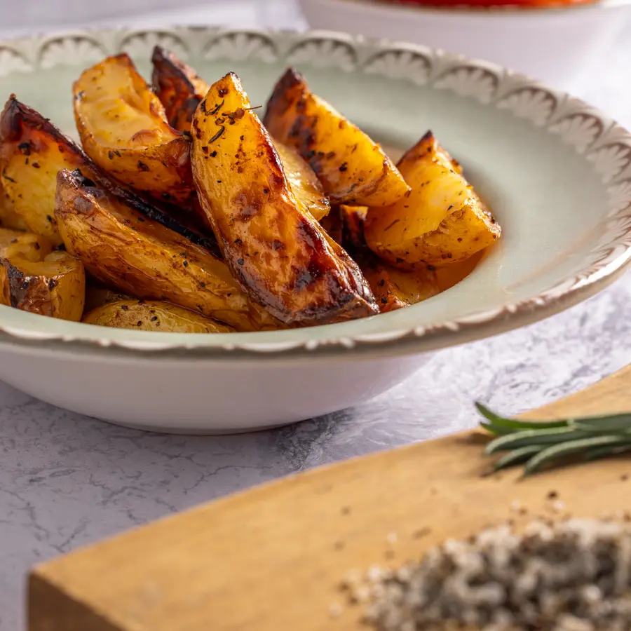 סירות תפוחי אדמה אפויים בתנור עם שמן זית, עשבי תיבול ותבלינים, עד להזהבה וקבלת מרקם פריך מבחוץ ורך מבפנים.