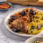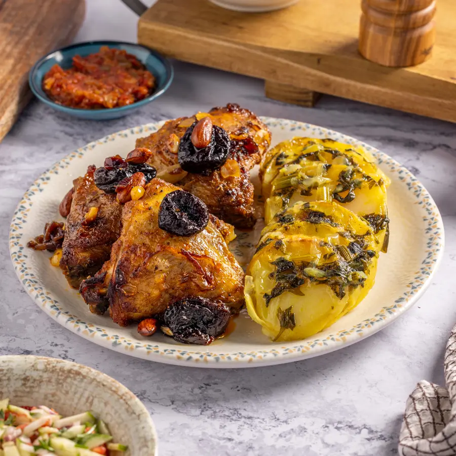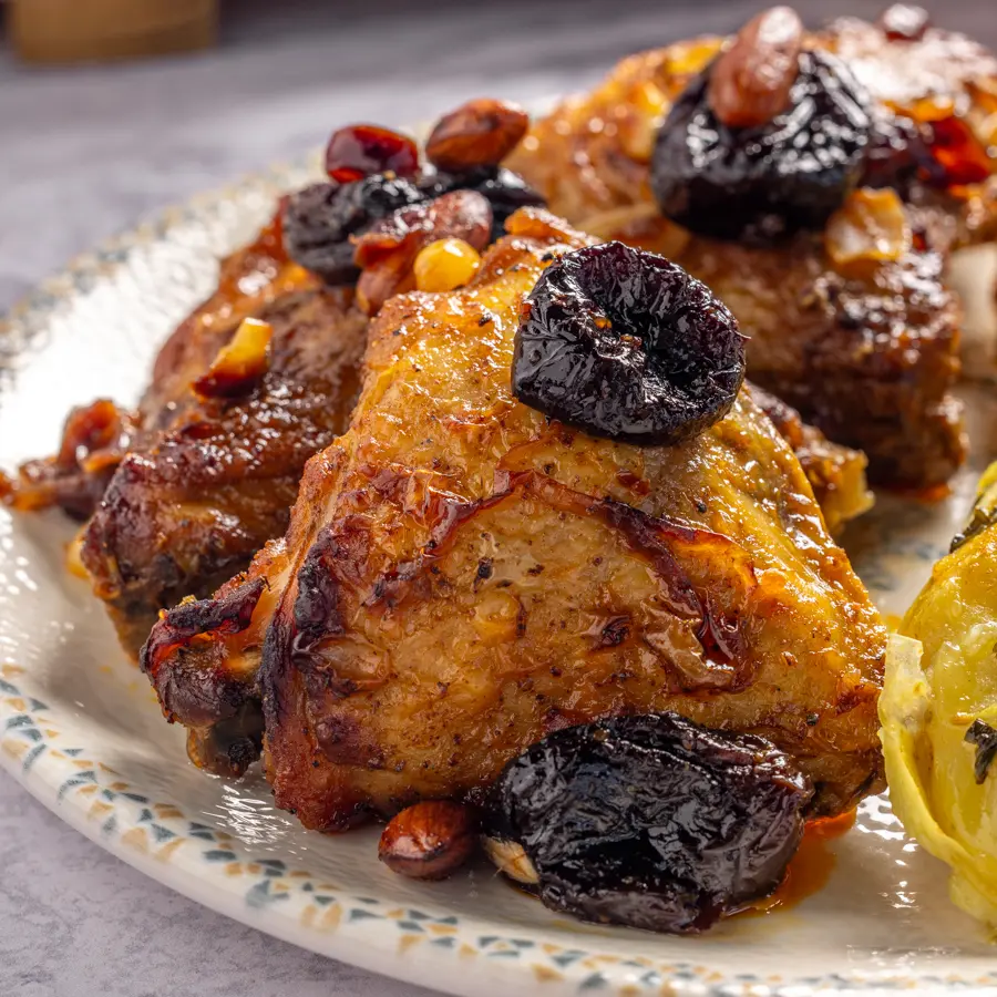 ירכי עוף מבושלות בעדינות יחד עם תערובת פירות יבשים, לקבלת מנה עשירה בטעמים מתקתקים ומלאים.