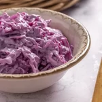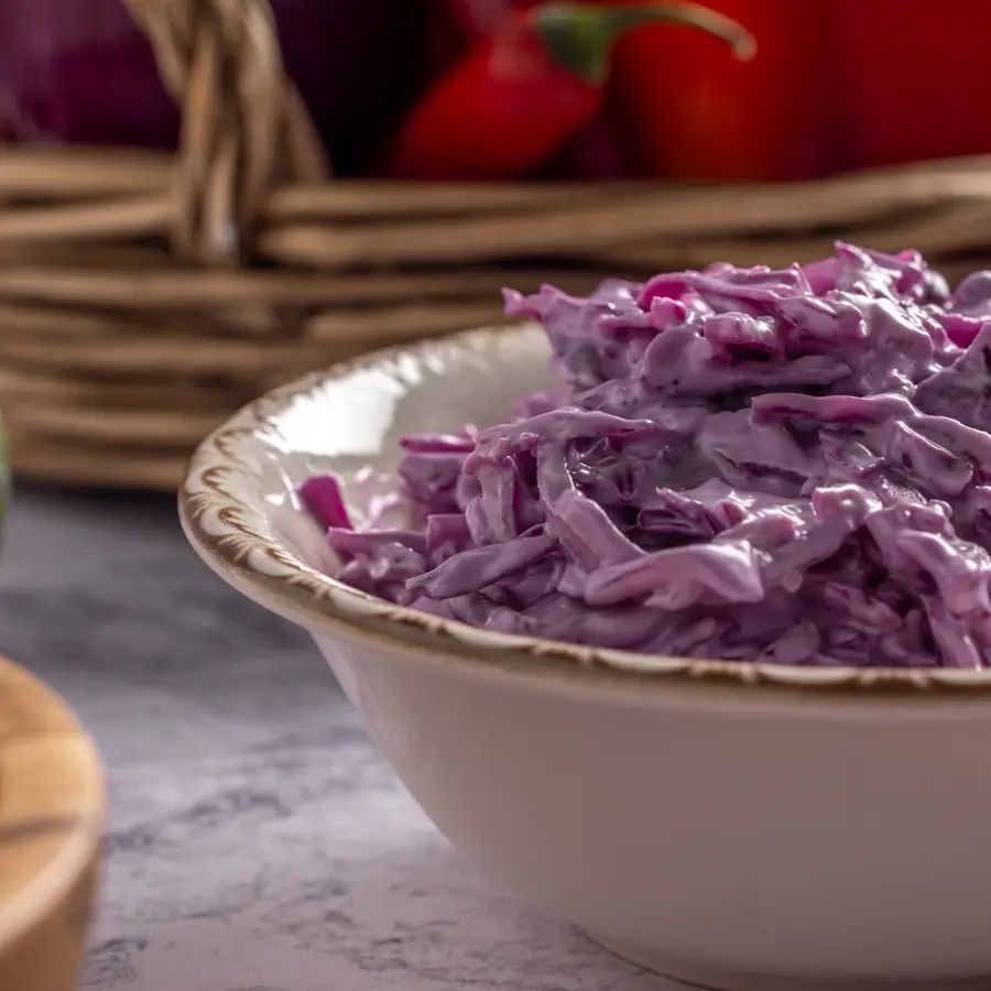 כרוב אדום פריך במיונז עשיר, מתובל בעדינות, יוצר סלט קרמי עם נגיעות מתקתקות וטעם רענן.