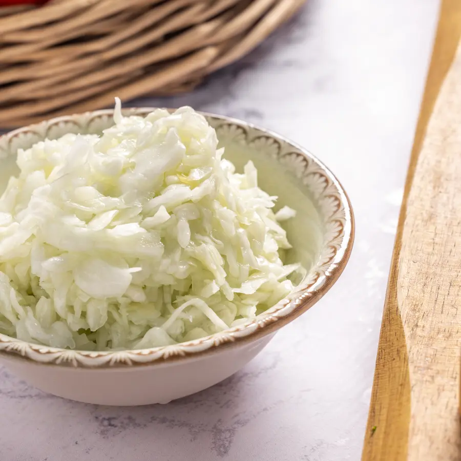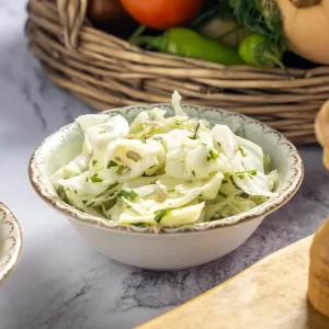 סלט כרוב לבן קלאסי, פריך ורענן, מתובל בעדינות עם לימון ושמן זית, מדגיש את הטעם הטבעי והעדין של הכרוב.