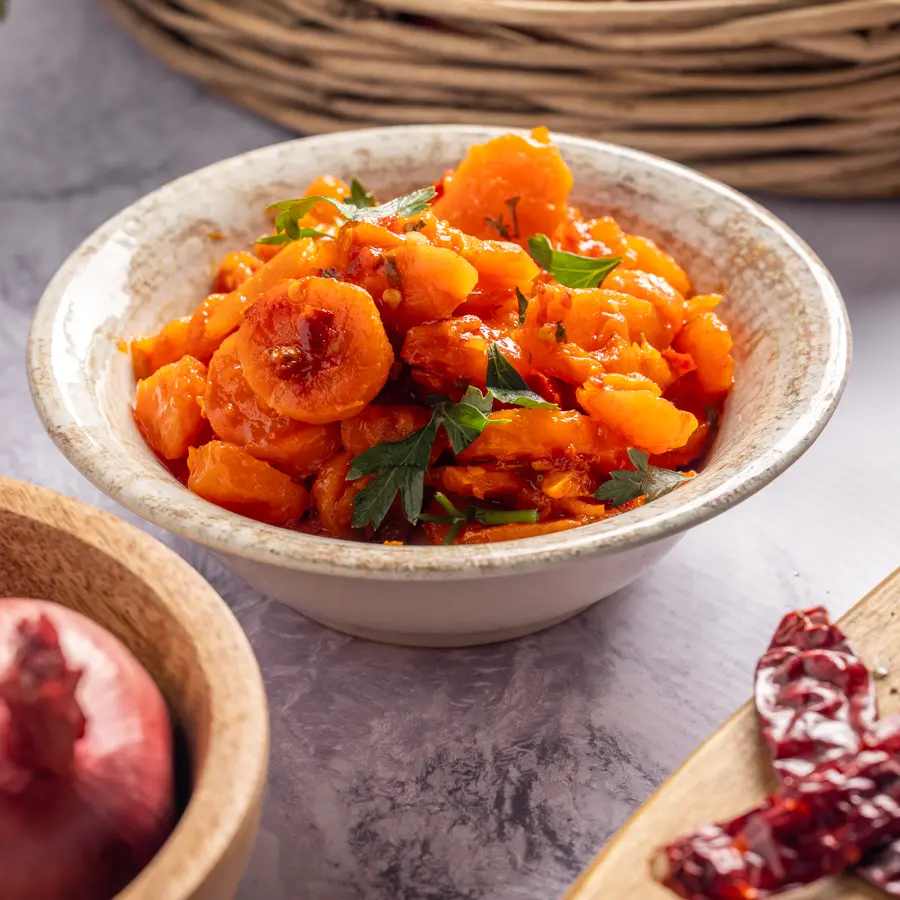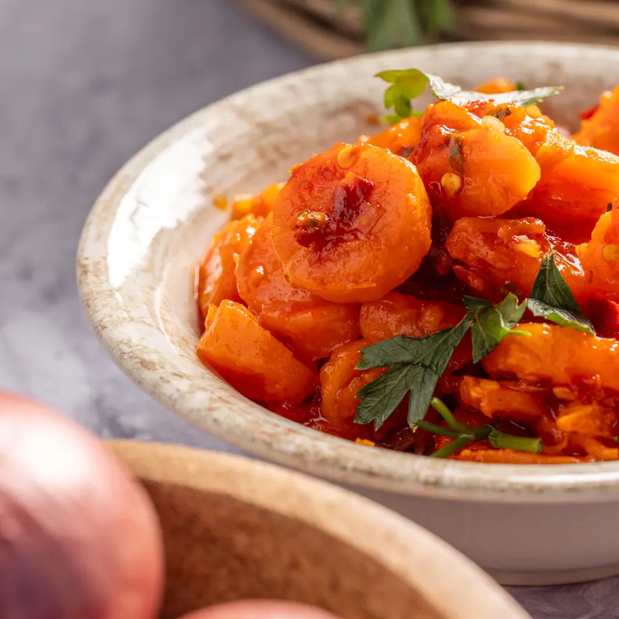 פרוסות גזר מבושלות ומטובלות בתערובת תבלינים מרוקאיים, עם שום, פפריקה, כמון ולימון, לקבלת טעם עשיר ומעט פיקנטי.