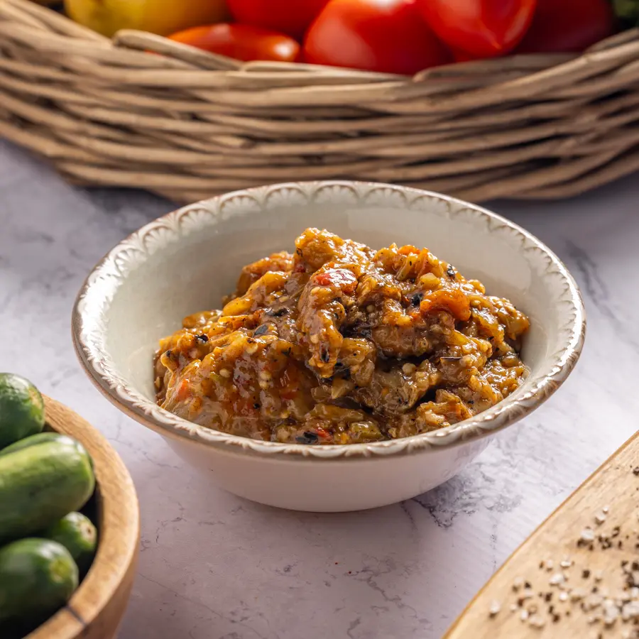 פלפלים, עגבניות ושום קלויים על האש, מתובלים בשמן זית, עם טעמים מעושנים ורכים שמדגישים את העסיסיות של הסלט.