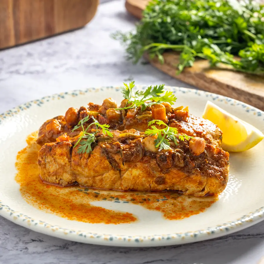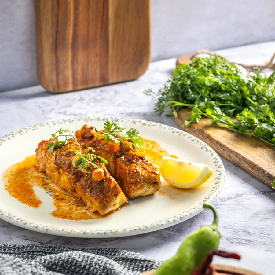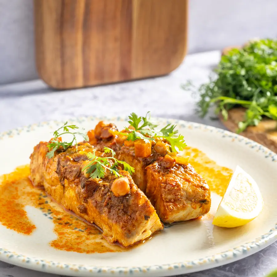 נתחי סלמון מבושלים ברוטב חריימה פיקנטי ועשיר, עם ...