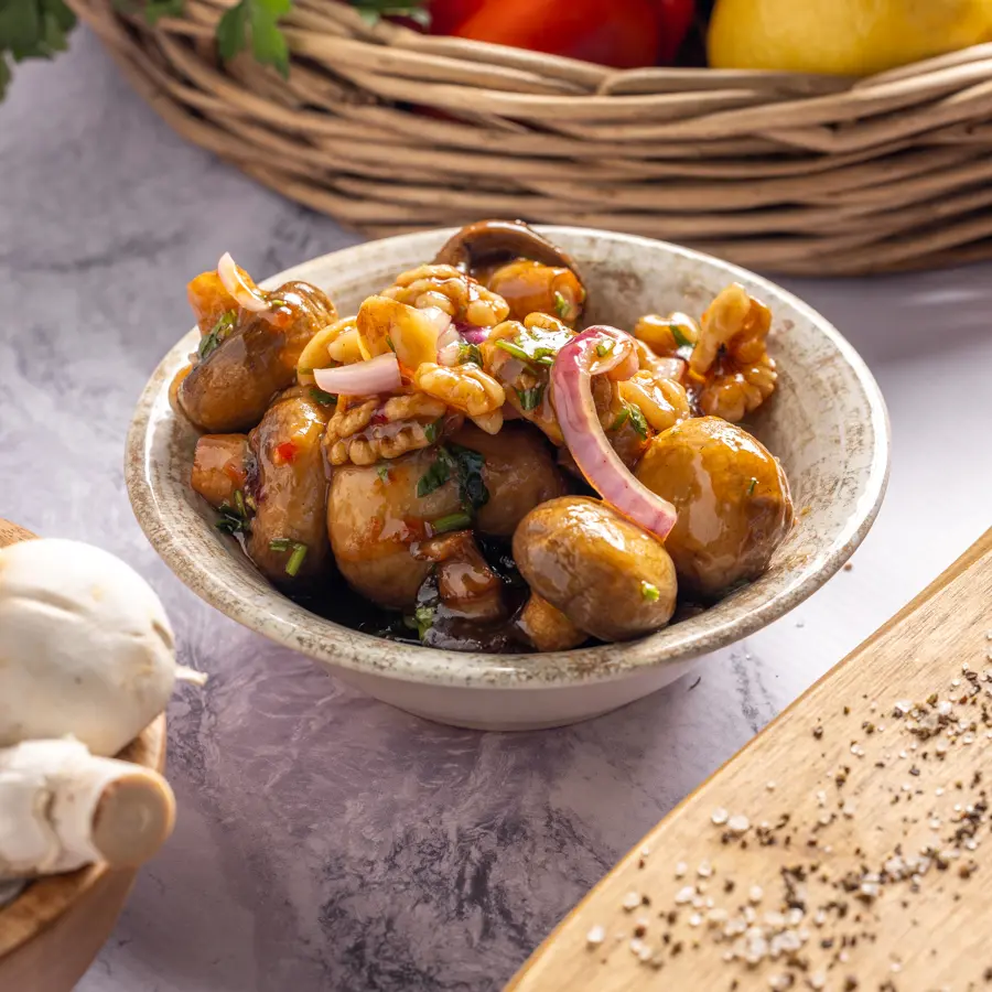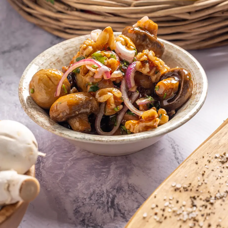סלט פטריות מוקפצות עם צ'ילי חריף ואגוזים קראנצ'יים, מתובל בשמן זית ונגיעות שום, יוצר מנה פיקנטית ועשירה בטעמים ובמרקמים.
