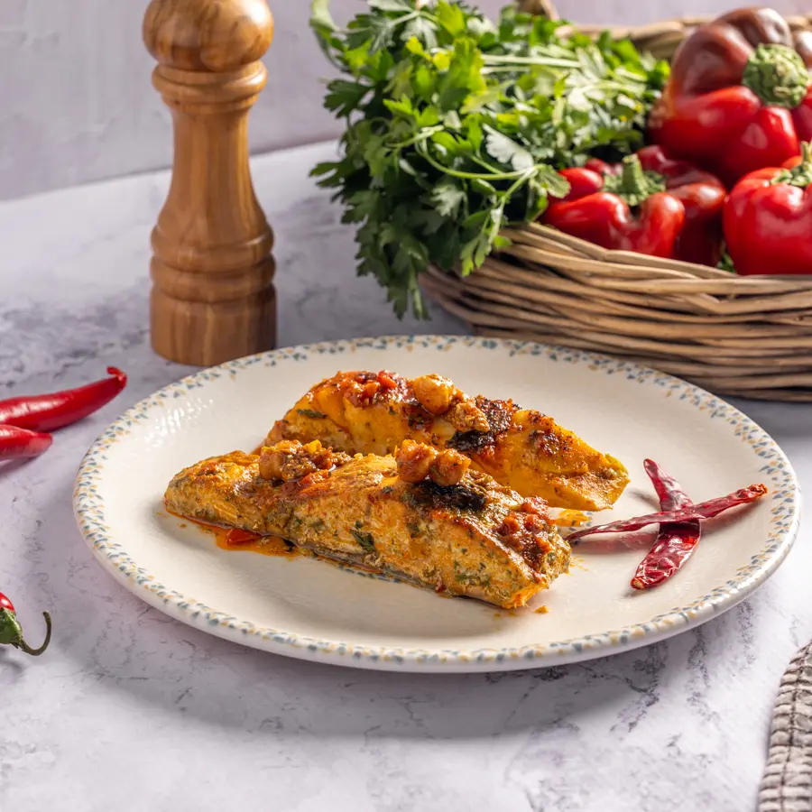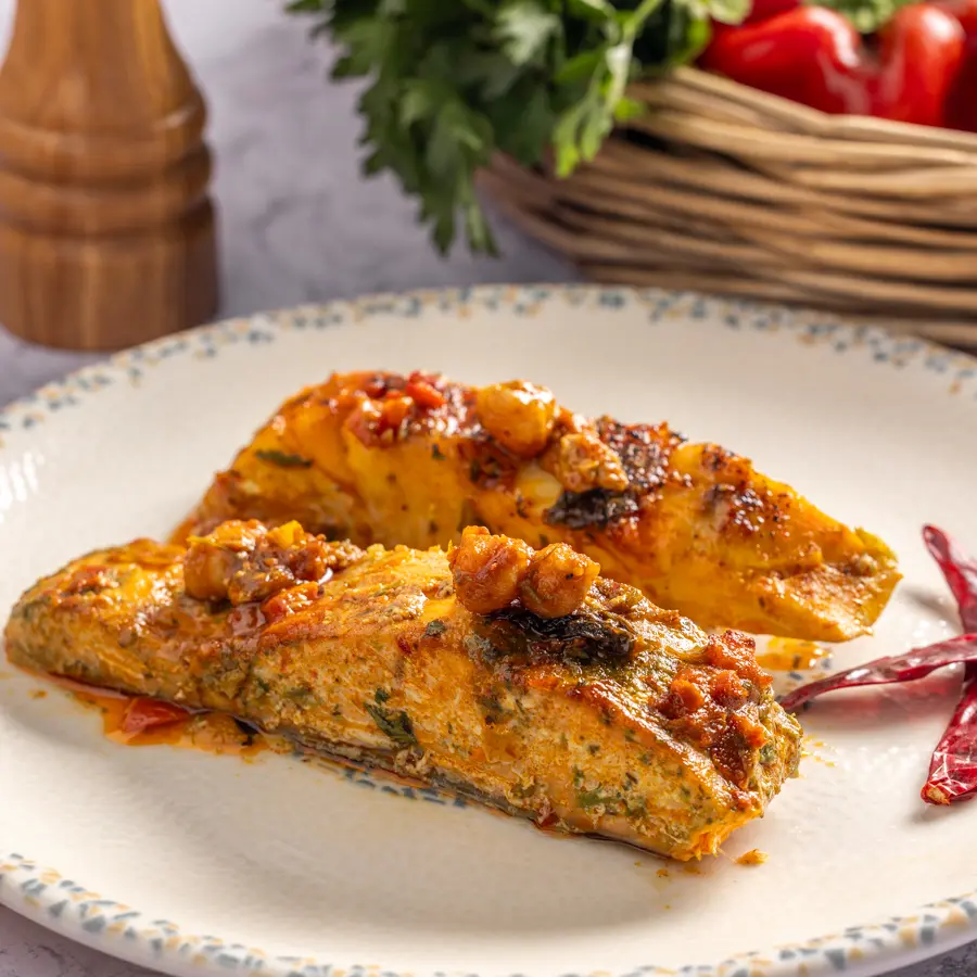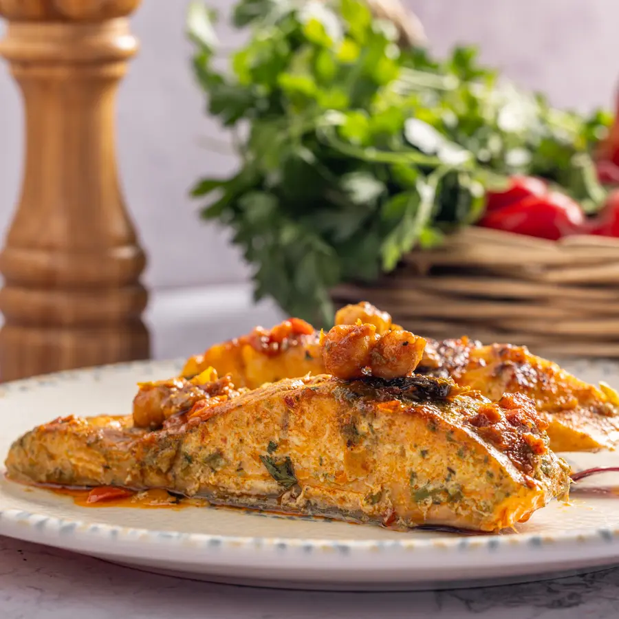 נתחי סלמון מבושלים ברוטב חריימה פיקנטי ועשיר, עם גרגירי חומוס רכים שסופגים את הטעמים. מנה מסורתית ומלאת טעם.