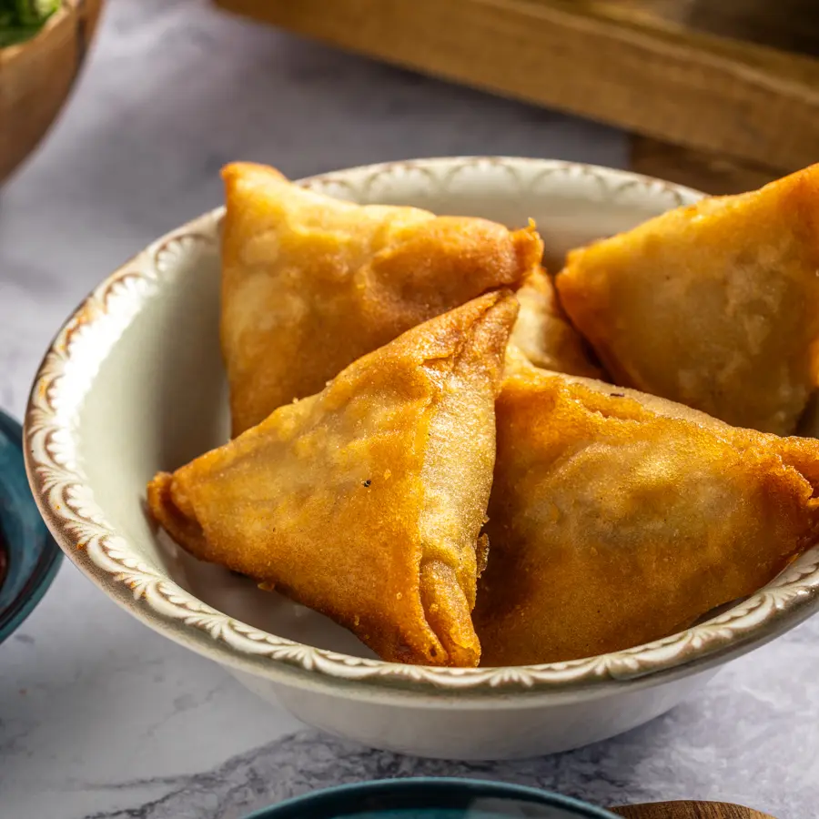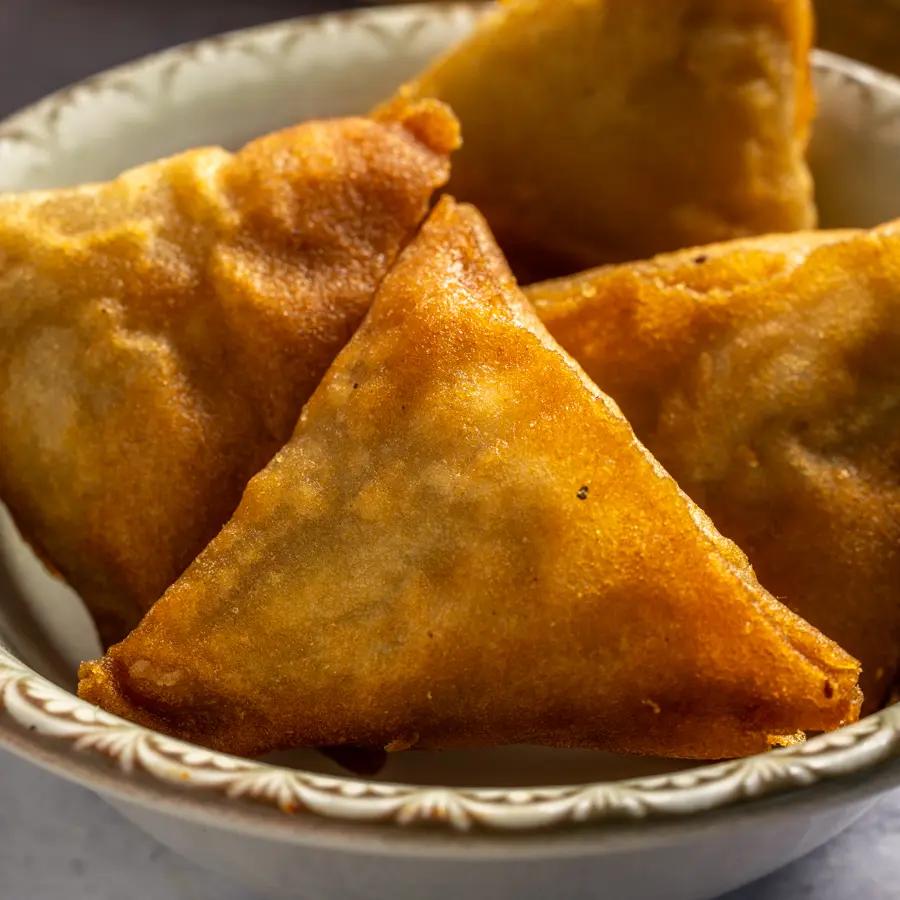 כיסוני בצק ממולאים במחית תפוחי אדמה מתובלת, מטוגנים עד להזהבה.