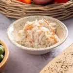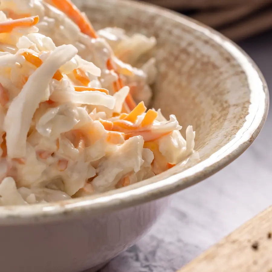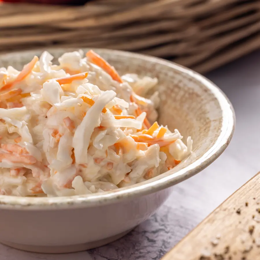 סלט קולסלאו קלאסי עם כרוב לבן, גזר פריך ומיונז קרמי, משולבים בטעמים מתקתקים ומרקם קראנצ'י.