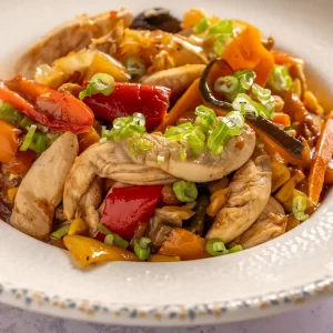 מוקפץ ירקות ונתחי עוף