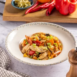 רצועות עוף עסיסיות מוקפצות עם מגוון ירקות טריים ...