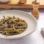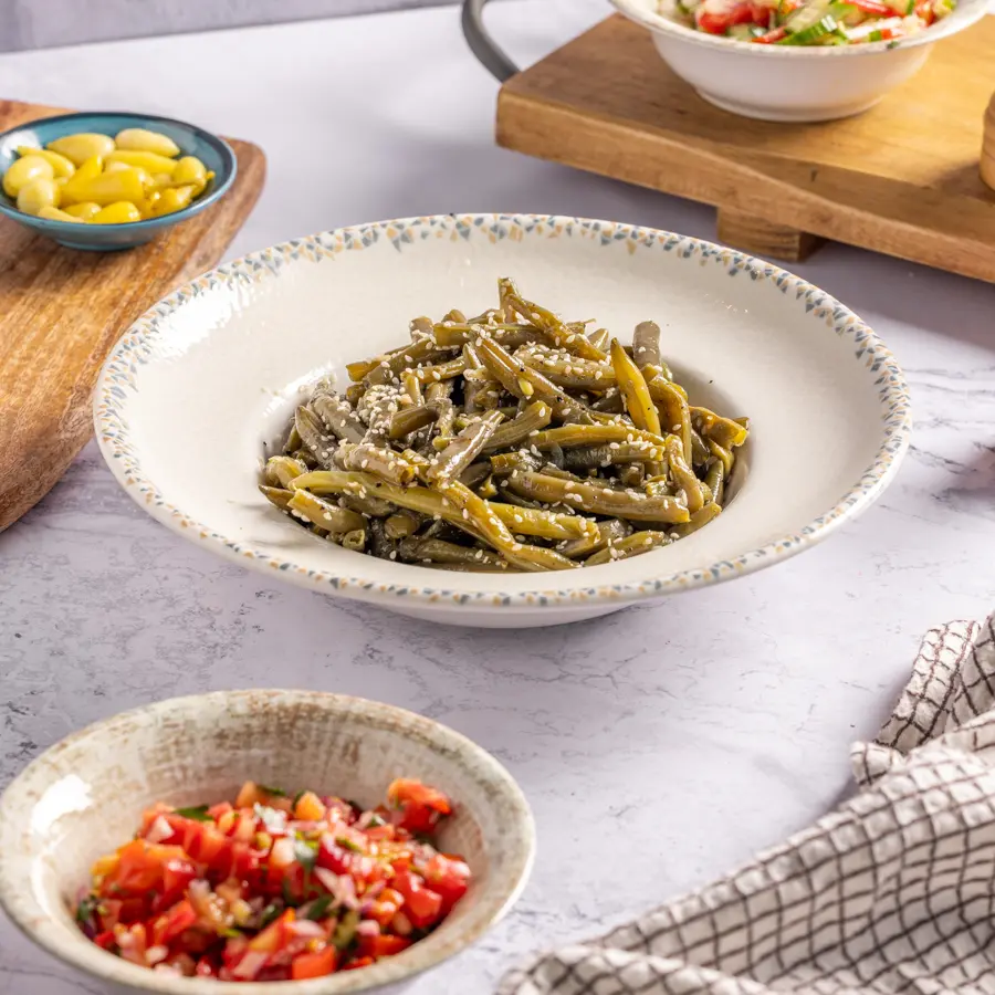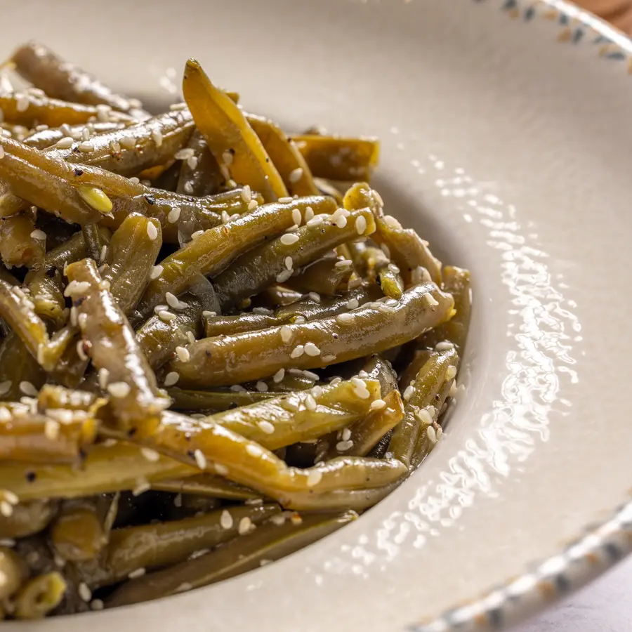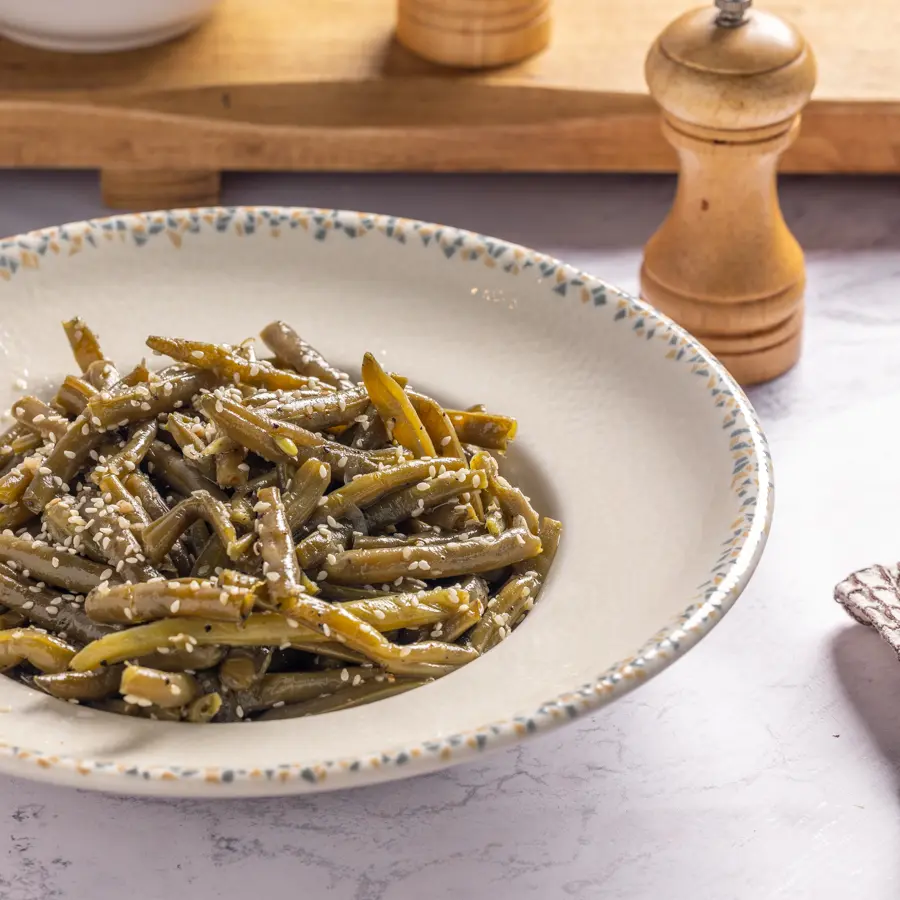 שעועית ירוקה טרייה, מוקפצת קלות עם שום ותבלינים עד למרקם פריך וטעם עשיר.