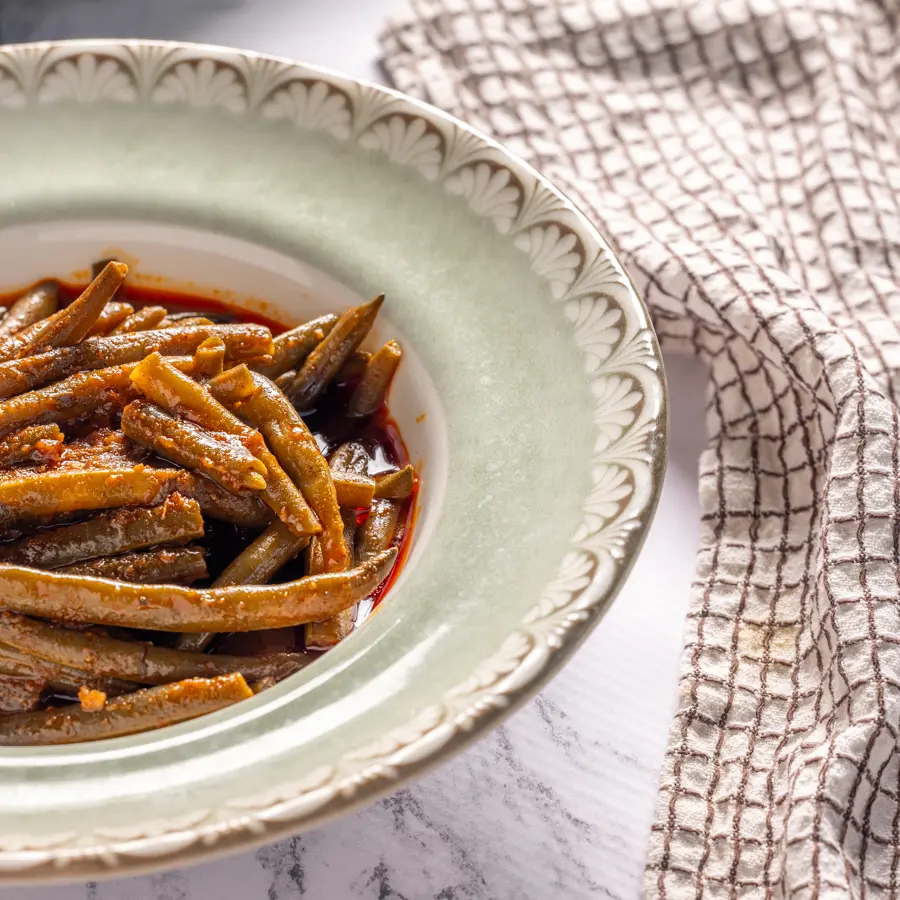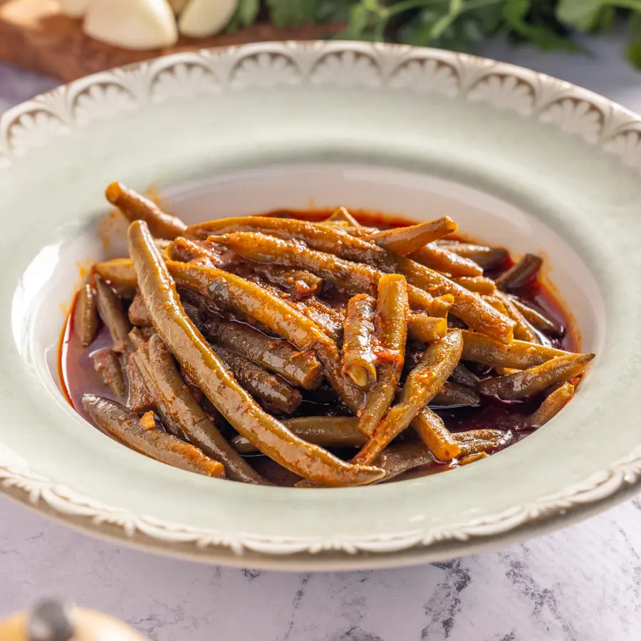 שעועית ירוקה מבושלת ברוטב עגבניות עשיר, מתובלת בעדינות עם שום ותבלינים.