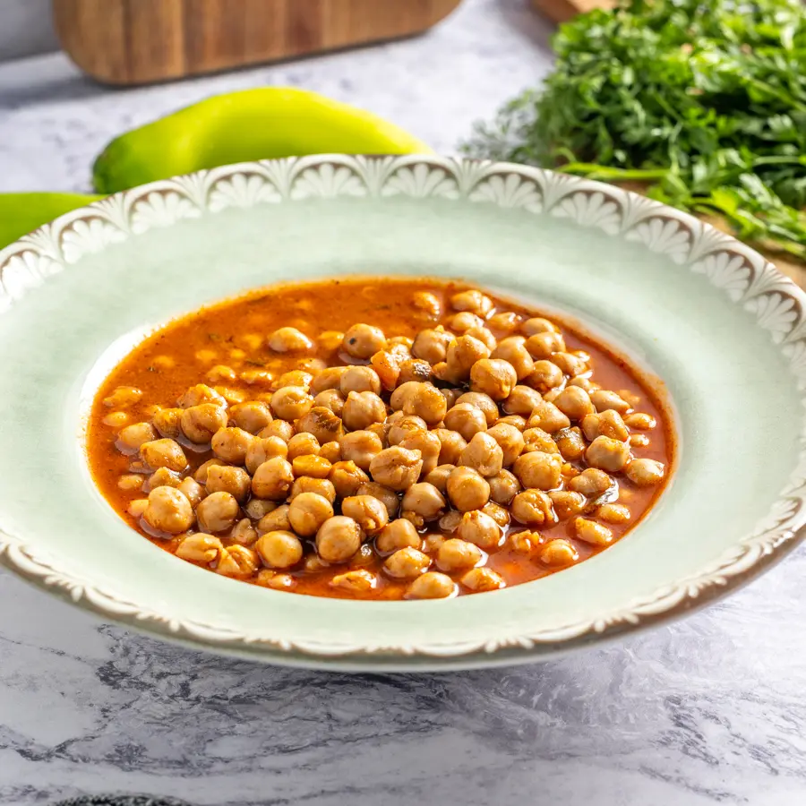 גרגירי חומוס רכים מבושלים ברוטב עשיר עם תערובת עשבי תיבול טריים.